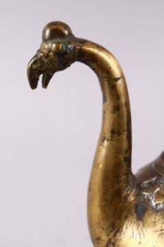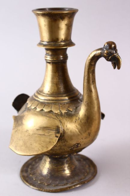 A 18TH CENTURY INDIAN BIRD FORM BRASS HUQQA BASE, 24cm high.