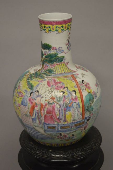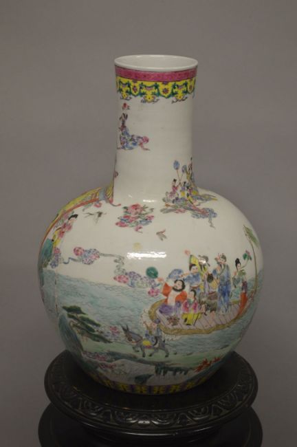 A LARGE LATE 19TH / EARLY 20TH CENTURY CHINESE FAMILLE ROSE PORCELAIN IMMORTAL VASE & STAND - the large bottle vase decorated profusely with scenes of immortals in landscape settings, further decorated with immortals on a boat at sea - with yellow borders and cloud decorations, together with the stand from situ - a dark carved hardwood triple claw foot stand - the vase 53cm high, the stand 80cm high