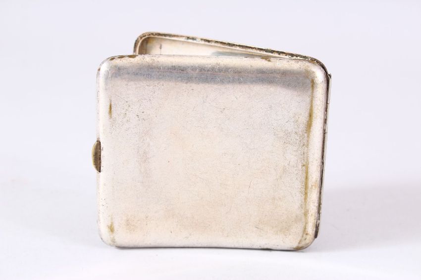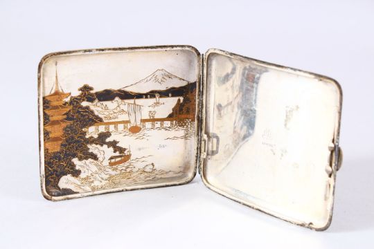 A JAPANESE MEIJI PERIOD SILVER & MIXED METAL CIGARETTE CASE - The exterior with native landscape waterside scenes, continued inside on one panel - the case marked sterling interior - 9cm