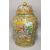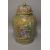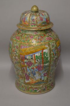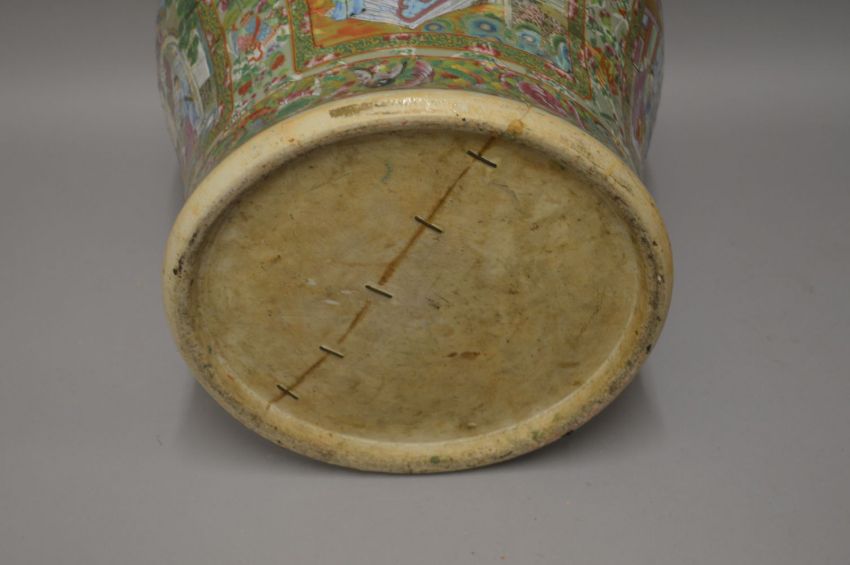 A LARGE CHINESE CANTON URN AND COVER, painted with panels of figures, profusely decorated with flowers, butterflies and precious objects, (af), 60cm high overall.