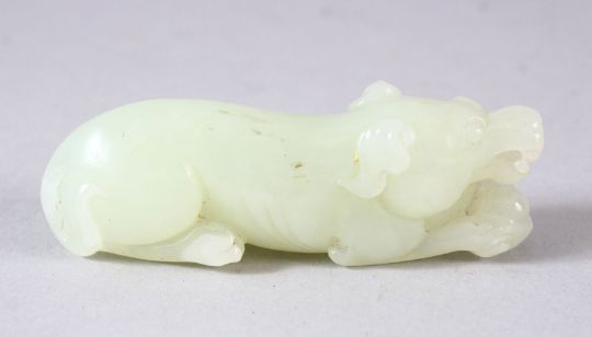 A CHINESE CARVED CELADON JADE PENDANT OF A DOG / BEAST - in a recumbent pose - 7.5cm