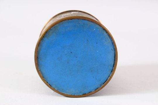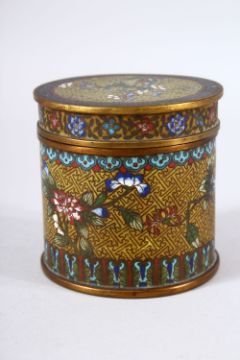 A 19TH CENTURY CHINESE CLOISONEE CYLINDRICAL BOX & COVER - decorated with flowers and insects on a geometric border ground - 9cm diameter