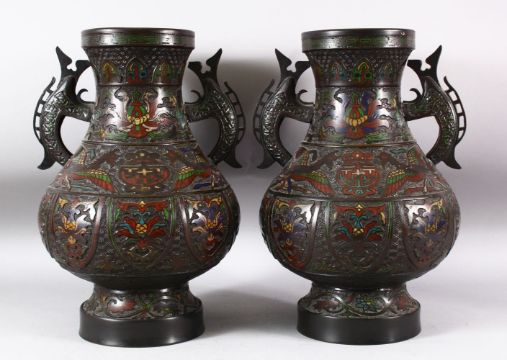 A PAIR OF JAPANESE CHAMPLEVE BRONZE CLOISONNE TWIN HANDLE VASES, the body decorated with enamelled floral sprays and phoenix, both approx. 37.5cm high.