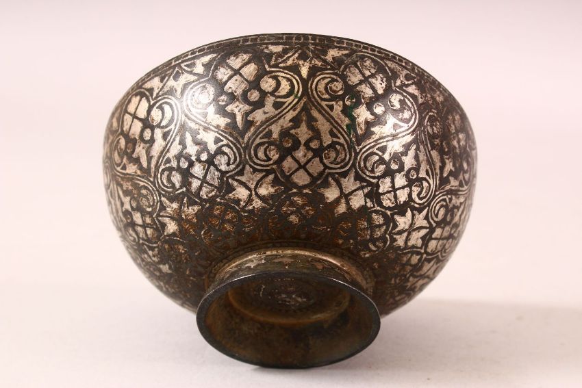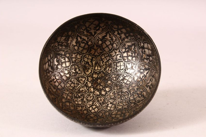 A FINE 19TH CENTURY INDIAN BIDRI SILVER INLAID BOWL - 12cm