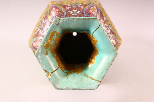 A CHINESE FAMILLE ROSE / FAMILLE JAUNE HEXAGONAL PORCELAIN VASE, painted with six oval panels depicting numerous figures in various settings, one panel with a female figure and phoenix, profusely decorated with floral motifs and foliate pattern work, mark to base, drilled, (af), 39.5cm high.