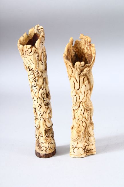 TWO CARVED BONE FIGURES, one depicting a demonic figure / deity, the other carved with beasts, 17.5cm and 19cm.