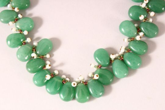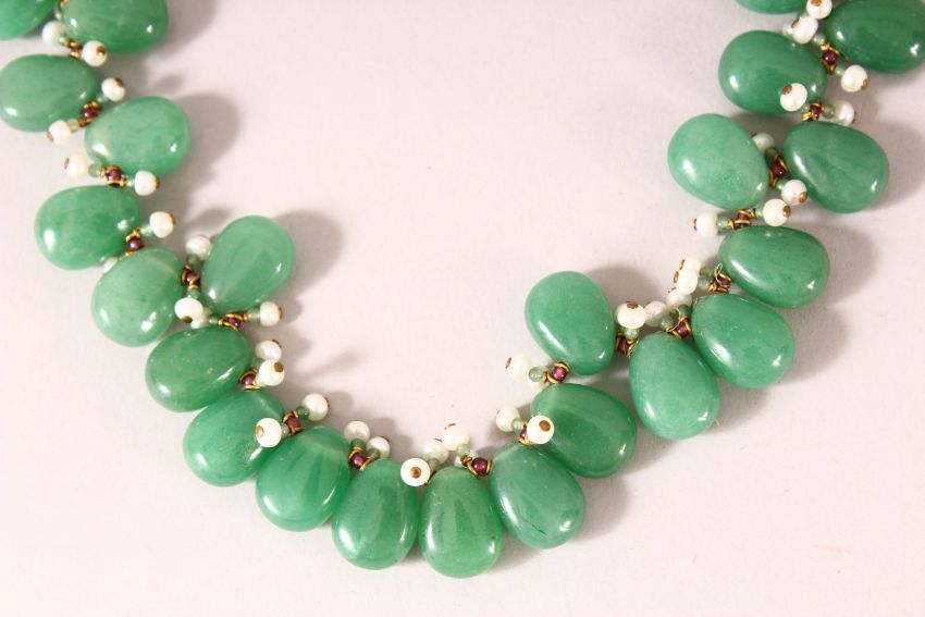 A CHINESE JADEITE AND SEED PEARL NECKLACE, each stone approx. 15mm.