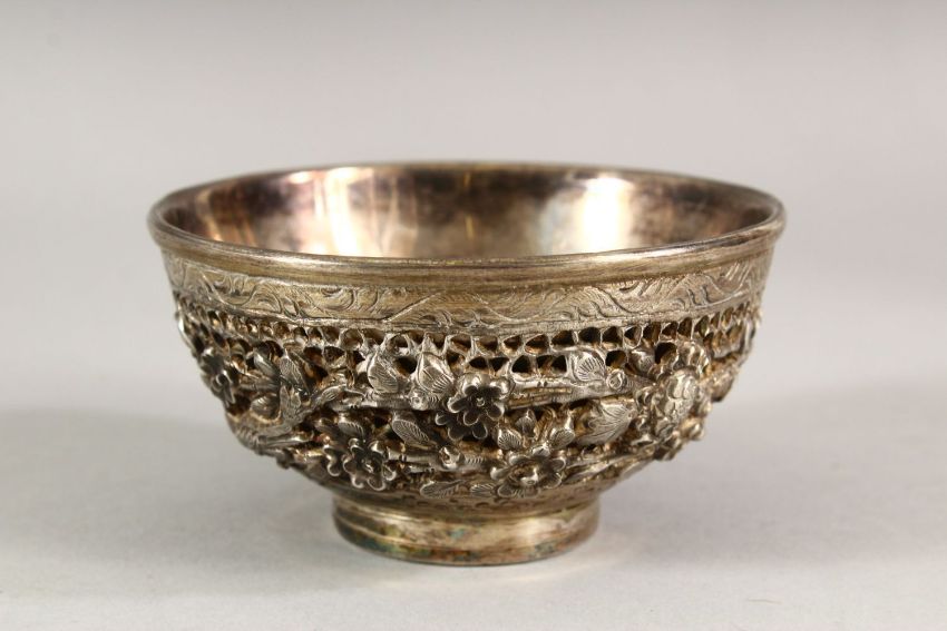 A FINE 19TH CENTURY BURMESE OPENWORK SILVER BOWL, 9cm diameter, together with a rectangular silver tray, decorated with two figures, 19.5cm long (2).