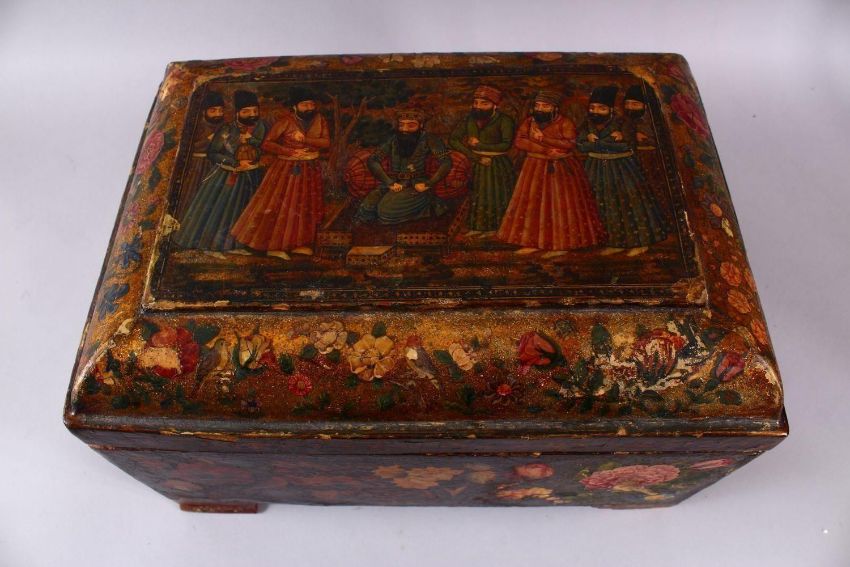 A GOOD PERSIAN QAJAR LACQUER PAINTED LIDDED BOX, decorated to the exterior with birds and detailed sprays of native flora, the lid decorated with gold spray and flora with a central painting depicting figures with gifts to a noble figure, the underside of the lid again finely painted with a panel depicting noblemen upon horseback attacking tigers, 28cm x 42cm x 28cm deep.
