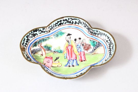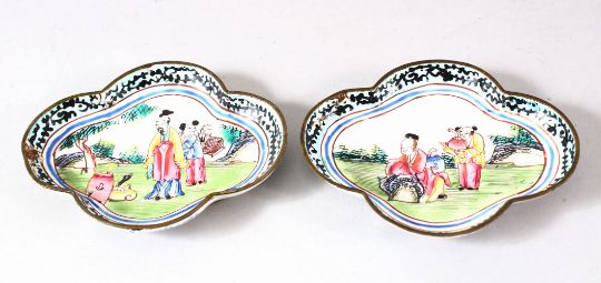 A PAIR OF CHINESE CANTON ENAMELLED DISHES, painted with figures in landscape settings, 9.5cm x 7.5cm.