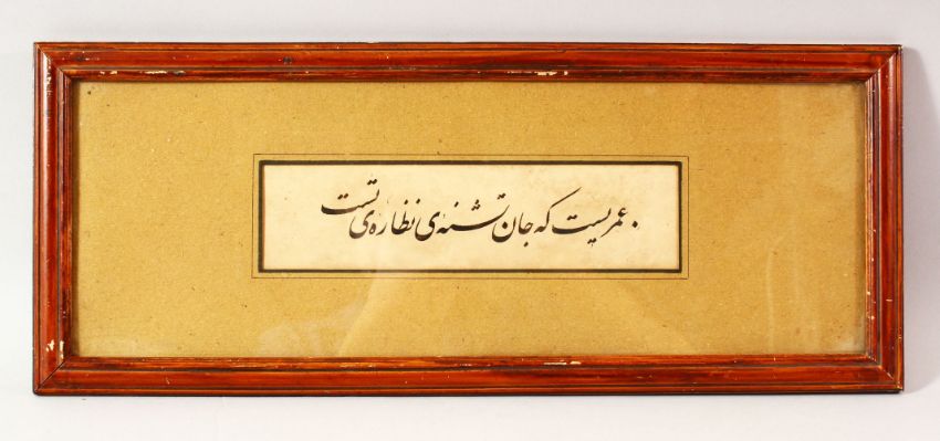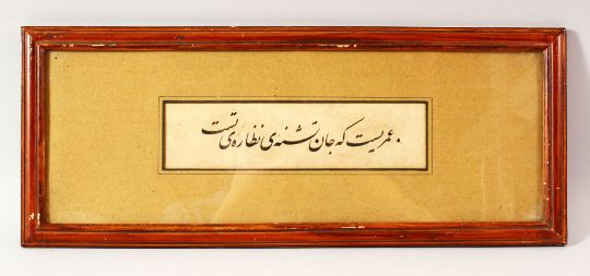 AN EARLY ISLAMIC CALLIGRAPHIC FRAMED SECTION, 51cm x 20cm