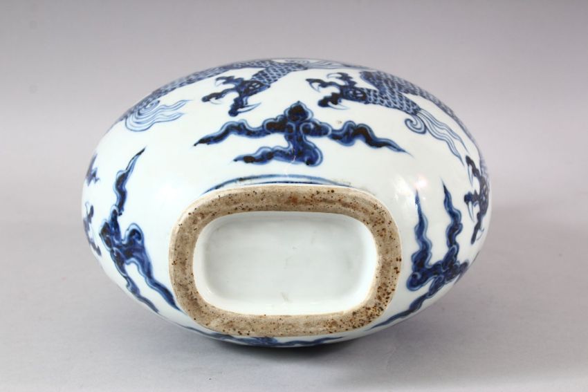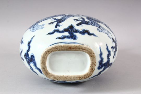 A CHINESE MINIG STYLE BLUE & WHITE PORCELAIN MOON FLASK - decorated with a dragon amongst clouds- the front with a six character mark - 30cm high