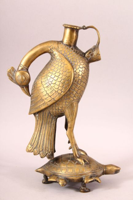 AN UNUSUAL INDIAN BRASS HUQQA BASE, in the form of a bird standing on a turtle, 28cm high.