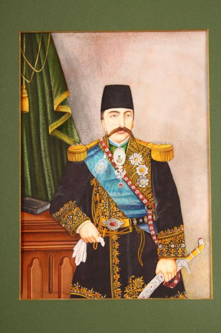 A HIGHLY DETAILED FINE QUALITY PAINTING OF MOZAFFAR AD-DIN SHAH QAJAR, mounted and framed, overall 49cm x 41cm.