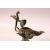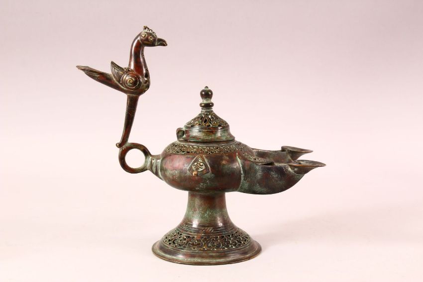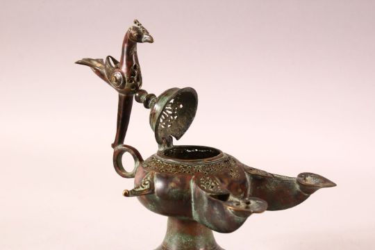 A PATINATED BRONZE OPENWORK INCENSE BURNER, the handle in the form of a bird, with twin spouts, twin handles and a stem foot, 24cm high.