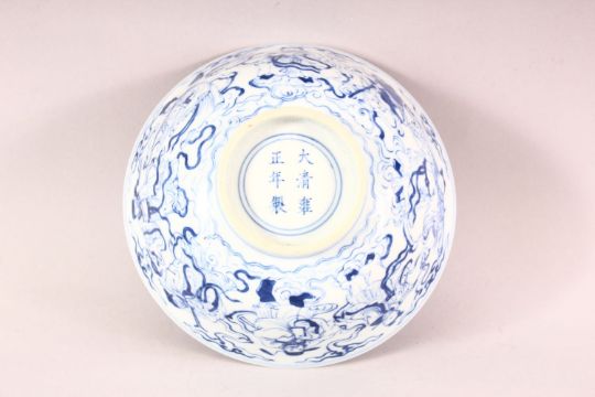 A CHINESE BLUE AND WHITE PORCELAIN IMMORTAL BOWL, the exterior decorated with eight immortals amongst clouds and waves, the interior decorated with shou lao seated with two attendants, six character mark to base, 16cm diameter.