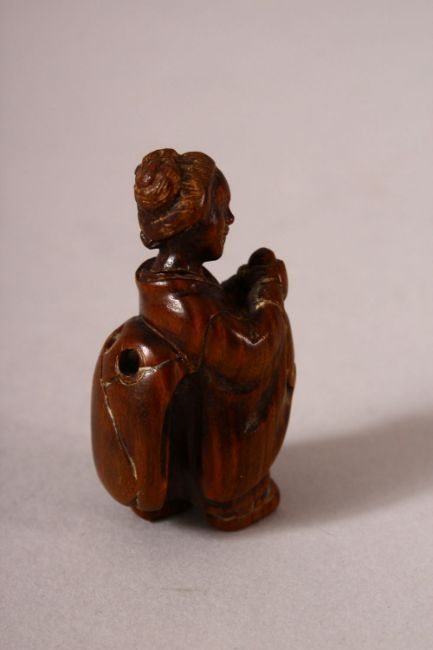 A JAPANESE MEIJI PERIOD CARVED WOOD NETSUKE OF A LADY - The lady stood with her hands together, signed to her back " Tadatomo " 5cm