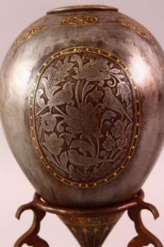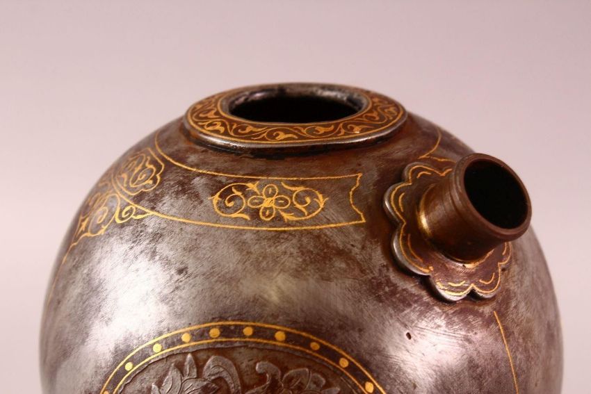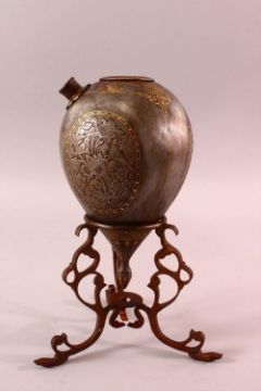 A GOOD 19TH CENTURY PERSIAN QAJAR INLAID STEEL HUQQA BASE & STAND, with carved birds and floral decoration with gold coloured decoration, with a tripod base, overall 28cm