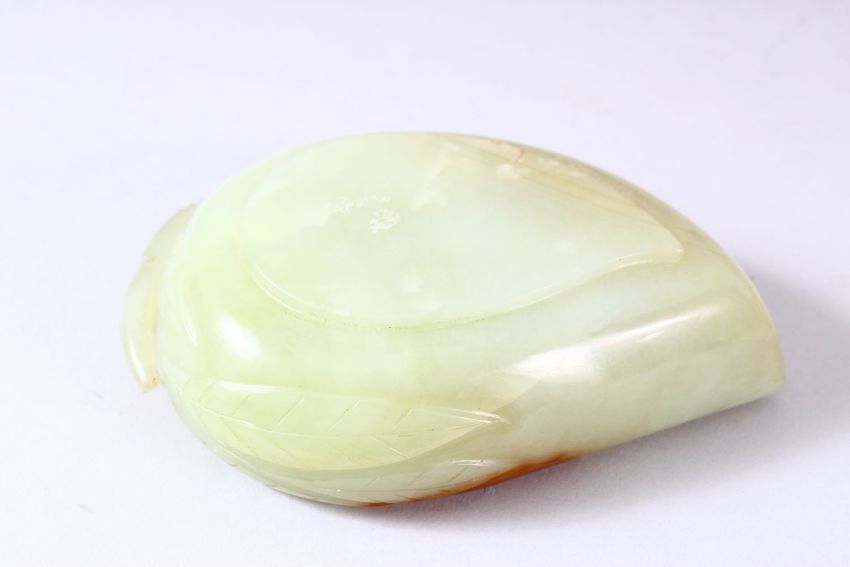 A CHINESE CARVED JADE BRUSH WASHER, in the form of a leaf, 14cm wide.