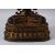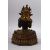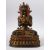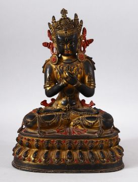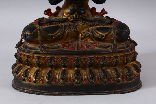 A TIBETAN GILT COPPER FIGURE OF YOGIMI / BUDDHA - in a seated pose with its hand crossed - poly chromed highlights, 32cm