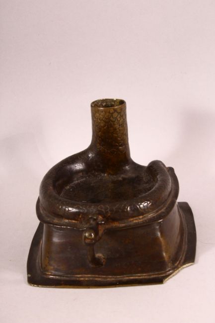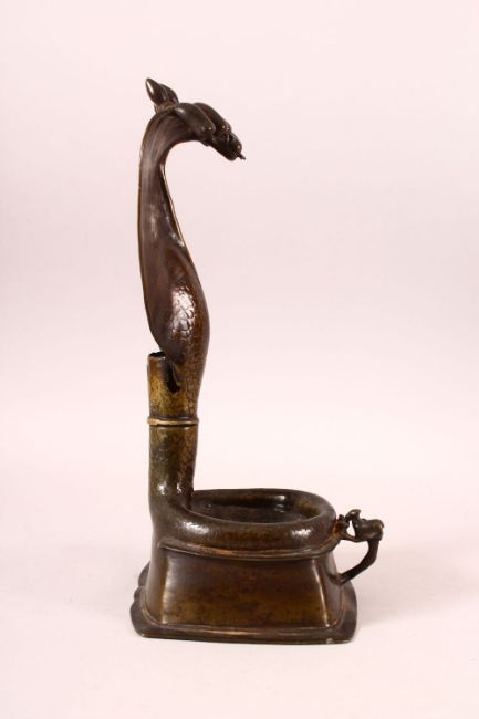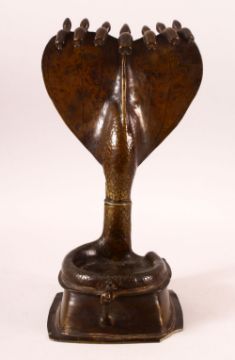 A FINE LARGE 17TH/18TH CENTURY SOUTH INDIAN BRONZE NAGA SNAKE FIGURE, sectional - in two pieces, 35cm high.