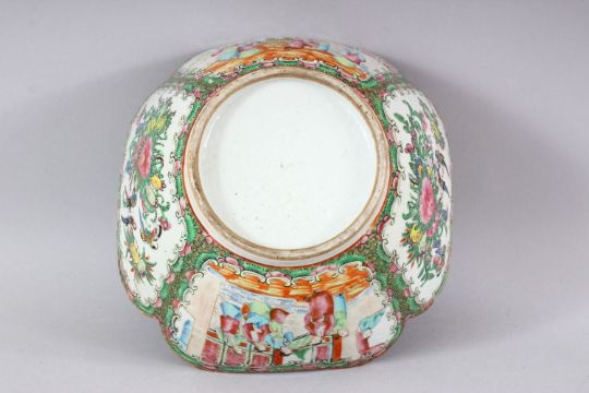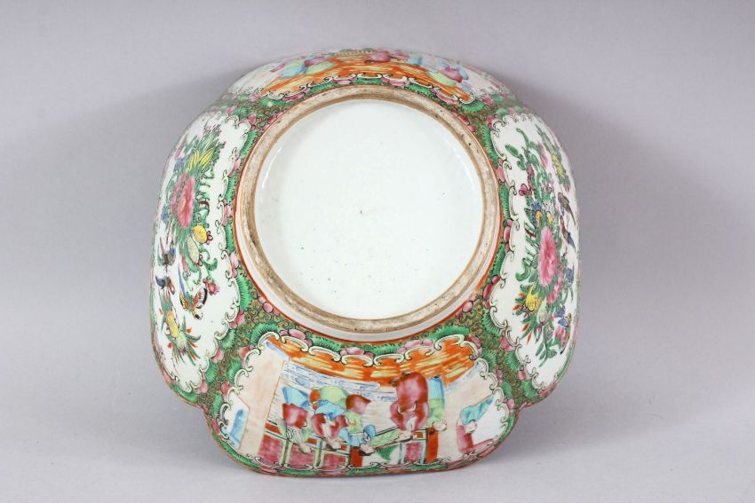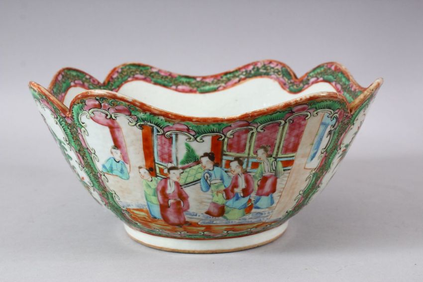 A 19TH CENTURY CHINESE CANTON FAMILLE ROSE PORCELAIN LOBED BOWL - the bowl with a lobed rim, decorated with panels of figures and birds - 24cm diameter