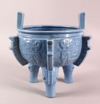 AN UNUSUAL CHINESE BLUE GLAZED PORCELAIN CENSER, with twin handles, body with archaic decoration, stood upon tripod elephant mask feet, 24.5cm x 27cm.
