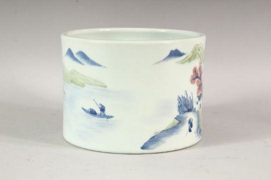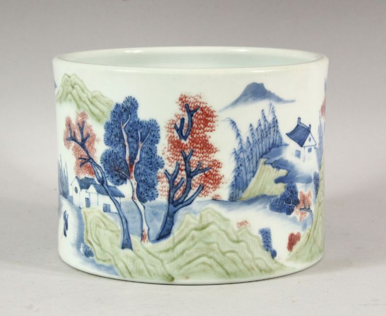A CHINESE BLUE, WHITE AND COPPER RED BRUSH POT, the sides with a continuous scene of houses, trees, mountains and figures in a boat, 18cm diameter, 30cm high.