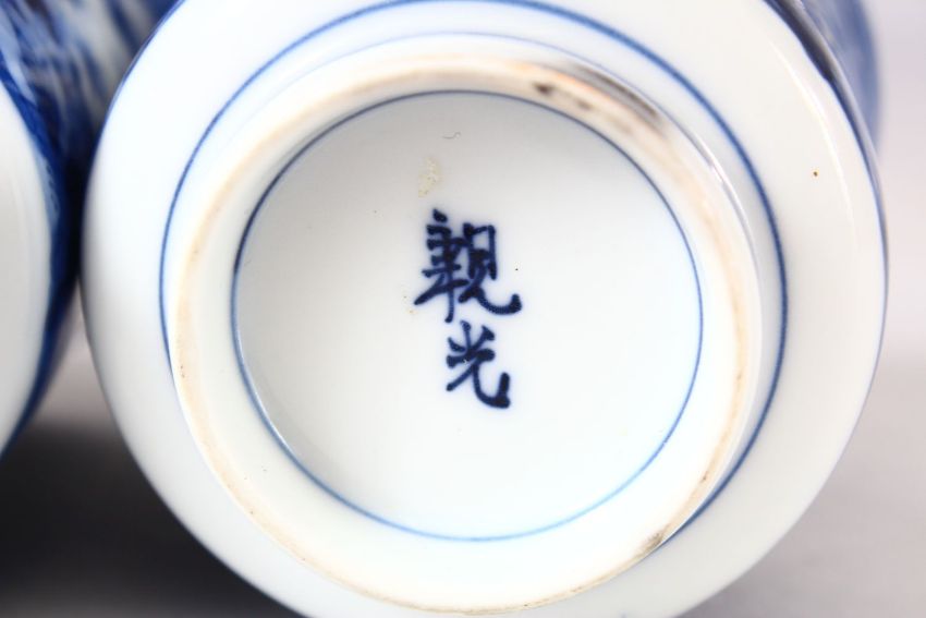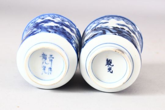 A NEAR PAIR OF JAPANESE BLUE AND WHITE PORCELAIN CUPS, decorated with boys in a landscape, 7.5cm and 8cm.