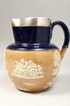 A SILVER MOUNTED ROYAL DOULTON JUG.