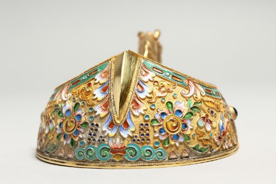 A GOOD RUSSIAN SILVER GILT AND ENAMEL KOVSH with horses head handle, 5ins long, mark Russian Eagle 84 & N.O1897