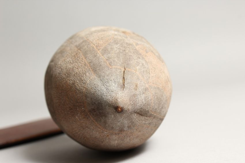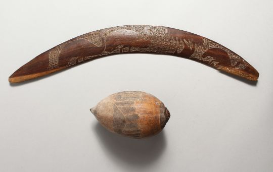 A CARVED WOOD BOOMERANG and a similarly carved nut (2).