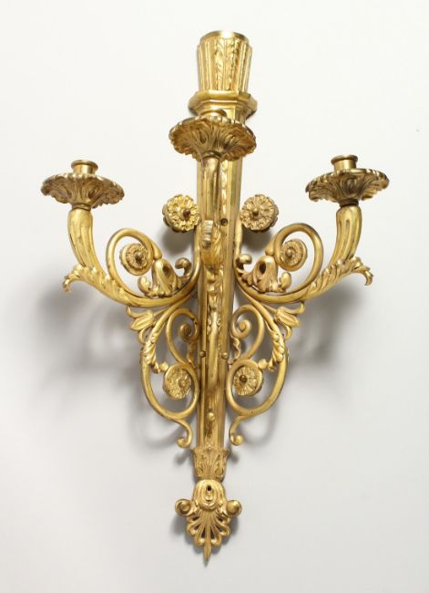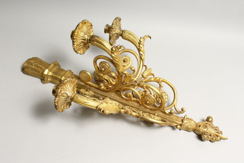 A GOOD ORMOLU BRONZE WALL LIGHT, with a quiver of arrows finaial, three scrolling branches with flower head bosses..