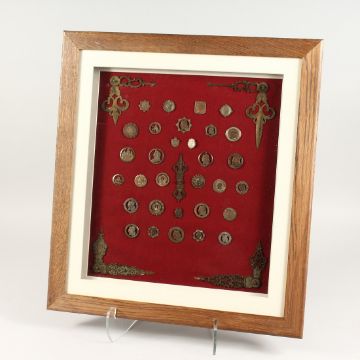 A COLLECTION OF FRAMED COINS, TIE PINS, BUTTONS, MEDALLIONS, AND CLOCK HANDS