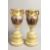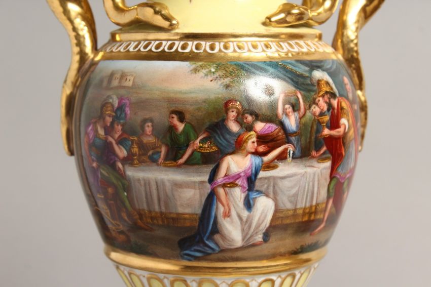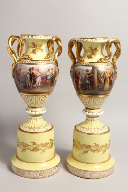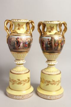 A VERY GOOD PAIR OF 19TH CENTURY YELLOW GROUP VIENNA TWO HANDLED URNS AND STANDS, with snake handles and painted with a continuous band of classical scenes.