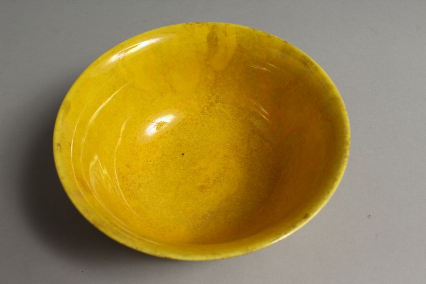 A YELLOW CHINESE CIRCULAR BOWL the side with dragon in relief