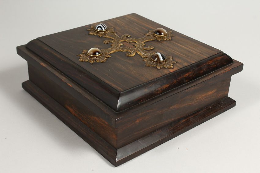 A VERY GOOD REGENCY ROSEWOOD SQUARE SHAPED GAMES BOX, the top with a brass cross and four onyx stones opening to reveal crib board, bezique board, mother of pearl counters etc..