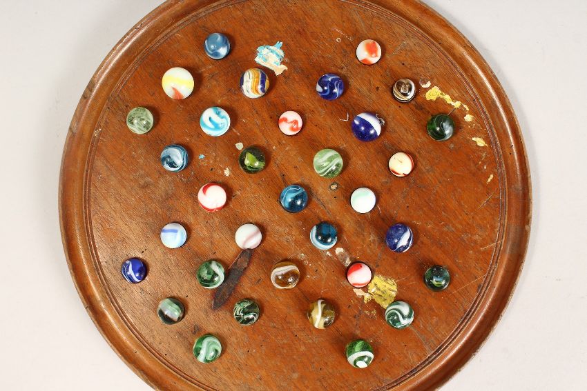 A LARGE 19TH CENTURY MAHOGANY CIRCULAR SOLITAIRE BOARD