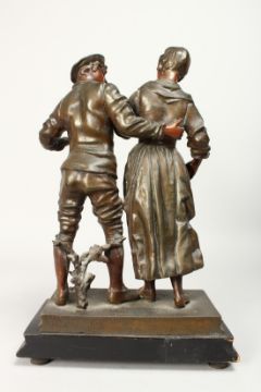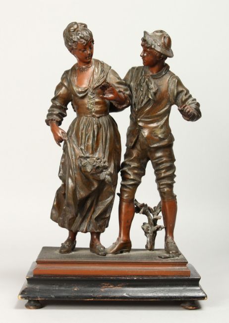 A 19TH CENTURY CONTINENTAL SPELTER GROUP OF A YOUNG LADY AND YOUNG MAN on a rectangular base.