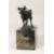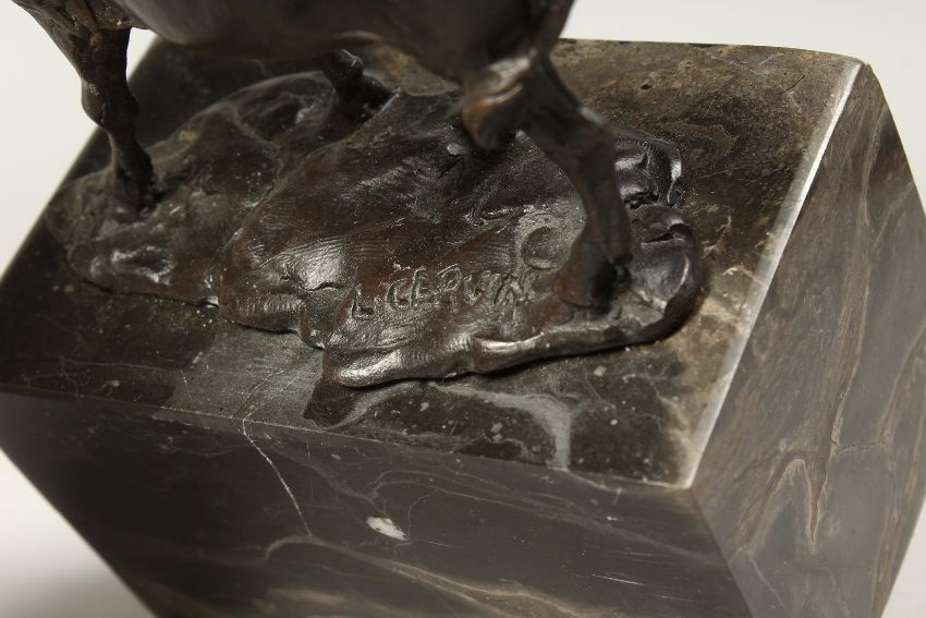 A SMALL BRONZE BULL 5ins long on a marble base.