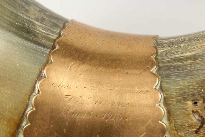 A VERY GOOD LARGE HORN TABLE SNUFF MULL, the curving form 18ins long with brass top and brass plaque engraved 'Congratulations from the oldest member W. Fletcher, Elmas, 1913', standing on an oval wooden base.