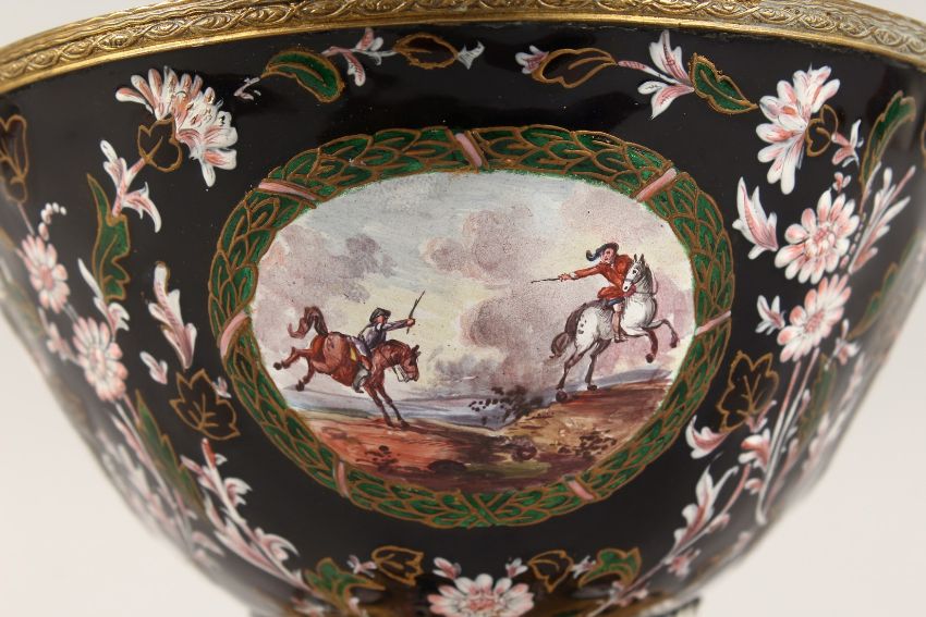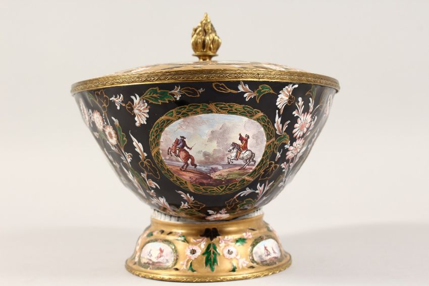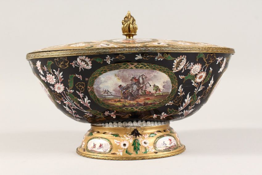 A VERY GOOD 19TH CENTURY ENAMEL CIRCULAR TUREEN AND COVER with various oval and circular scenes, after Wouverman.