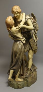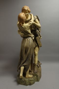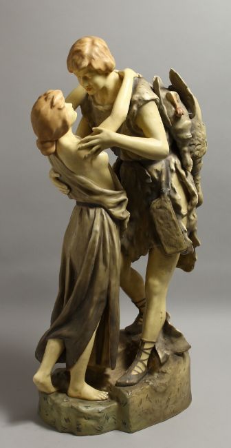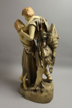 A LARGE ROYAL DUX STYLE POTTERY GROUP OF A YOUNG BOY AND GIRL, the boy with game on his hand.