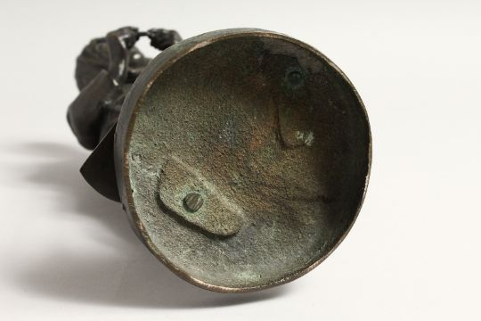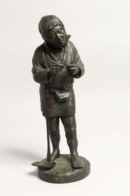A JAPANESE BRONZE FIGURE of a man holding a pipe