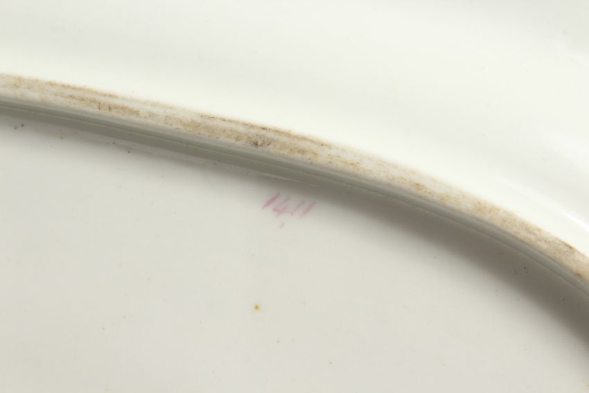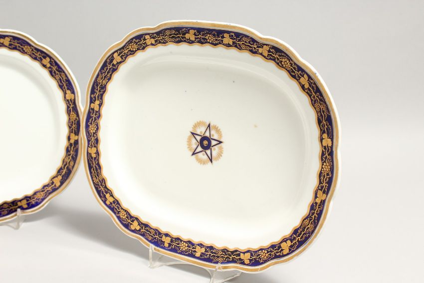 A PAIR OF OVAL PORCELAIN DISHES, white ground with blue and gilt grape and vine border.
