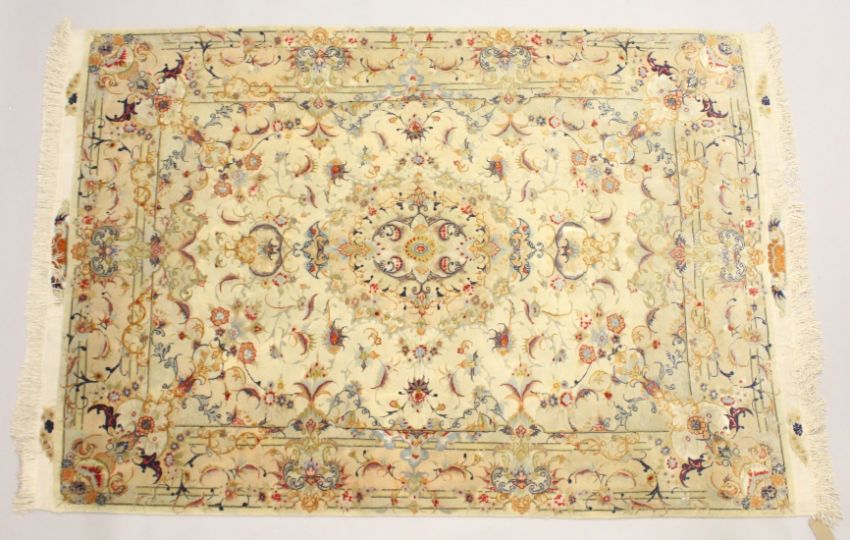 A FINE PERSIAN PART SILK TABRIZ RUG, cream ground with floral decoration.