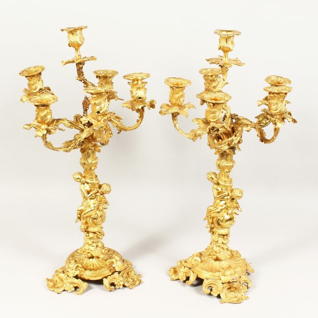 A SUPERB LARGE PAIR OF 19TH CENTURY SIX LIGHT ORMOLU CANDELABRA with shells, acanthus and cupids