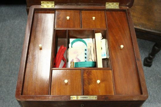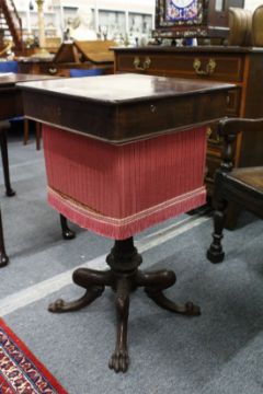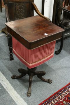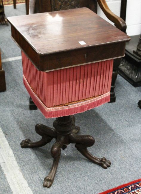 A 19TH CENTURY WORK TABLE, POSSIBLY ISLE OF MAN, with rising top fitted interior, supported on four curving legs.