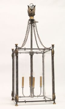A LARGE SQUARE SHAPED GLAZED METAL HANGING LANTERN with four candle holders
