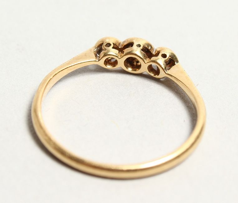 A 18CT GOLD THREE STONE DIAMOND RING.